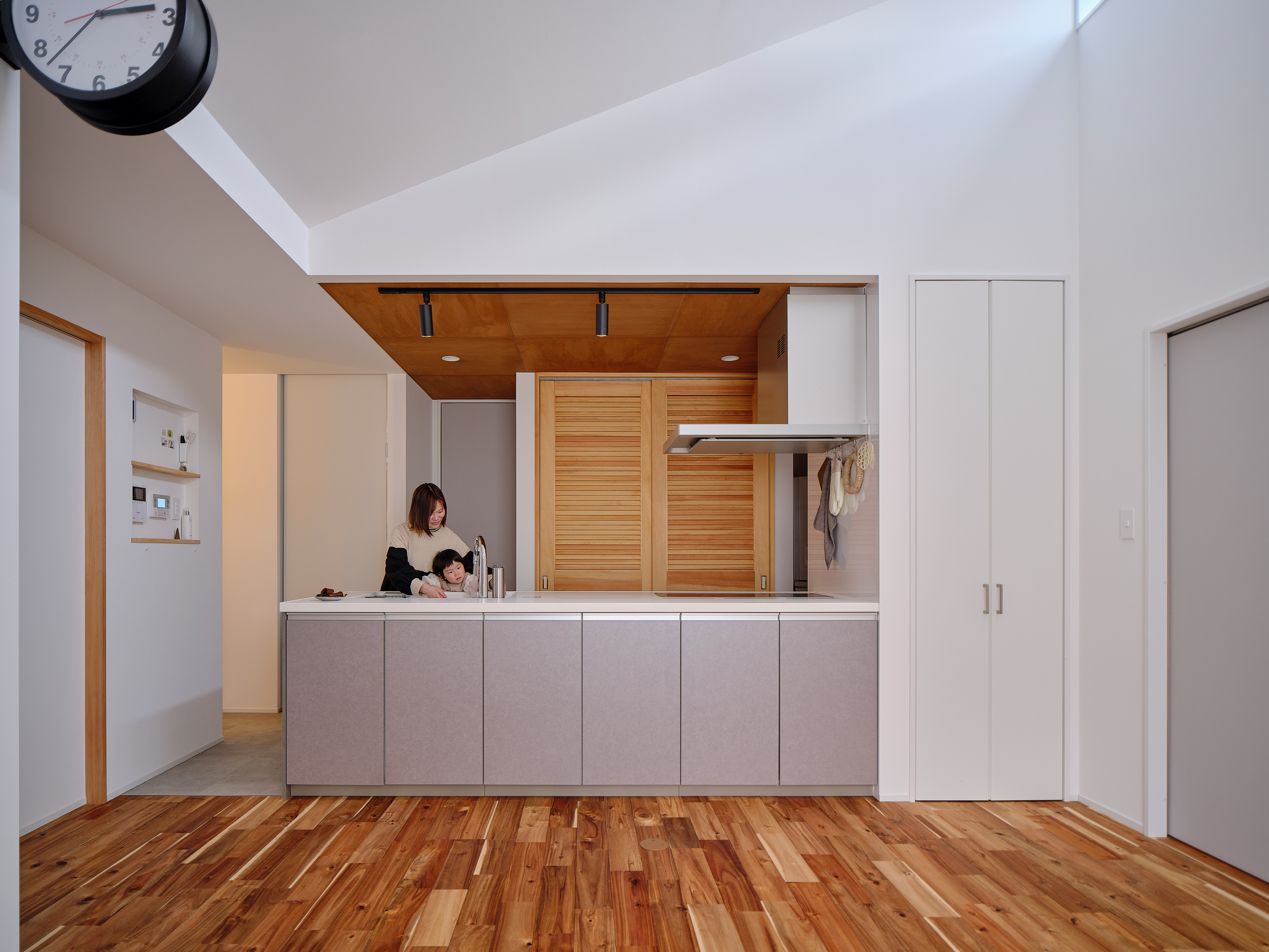 キッチン背面は扉で隠して生活感を軽減でき、かつ収納力も確保。